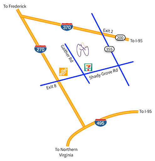 Take Exit 8 Shady Grove Road and bear right when approaching Shady Grove Road. Turn left at the second traffic light (Gaither Road) where there is a 7-Eleven on the corner. Enter the second Shady Grove Center entrance and proceed to suite 9041.