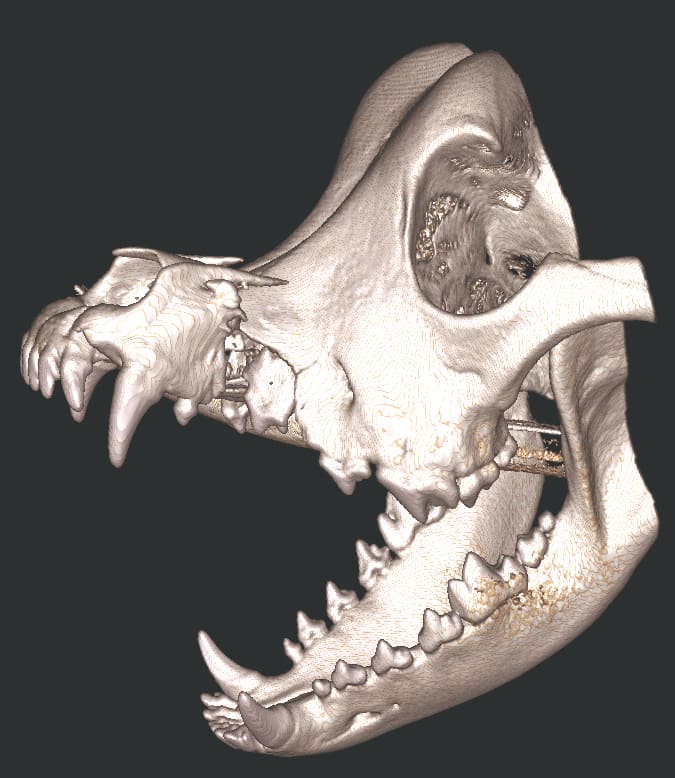 The Center now provides advanced imaging via cone beam CT. Cone beam CT is excellent for visualization of bony structures of the skull, nasal cavity, teeth, and ears. Cone beam CT is especially helpful for diagnosing dental disease and evaluation of jaw fractures. It can also be useful for evaluating the sinuses and tympanic bulla. Cone beam CT can be used in conjunction with nasal biopsy and culture to evaluate nasal discharge whether chronic or acute.