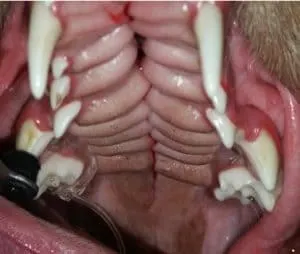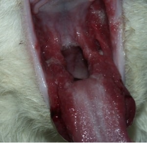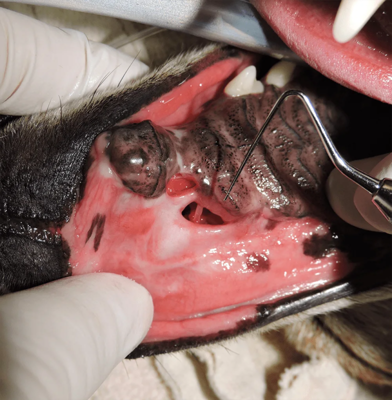 Some animals are born with a defect in their mouth called a cleft palate. These animals may have chronic upper respiratory infections and nasal discharge. They are also at risk for developing aspiration pneumonia. While repair of some of these defects may be difficult, there are multiple techniques available for repairing or reducing the size of the defects. We also repair acquired defects that resulted from the loss of teeth, trauma, or failure to heal after oral surgery.